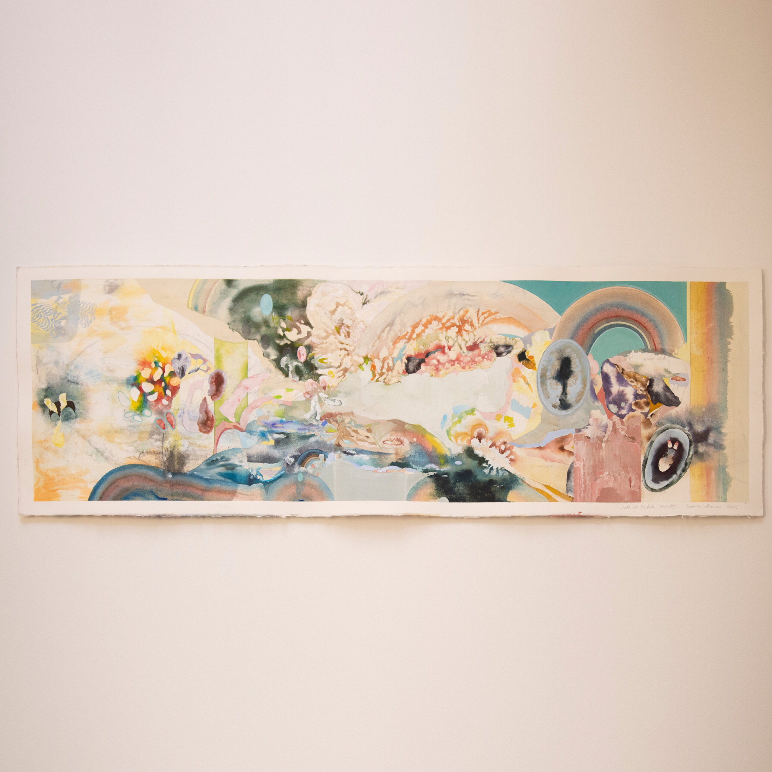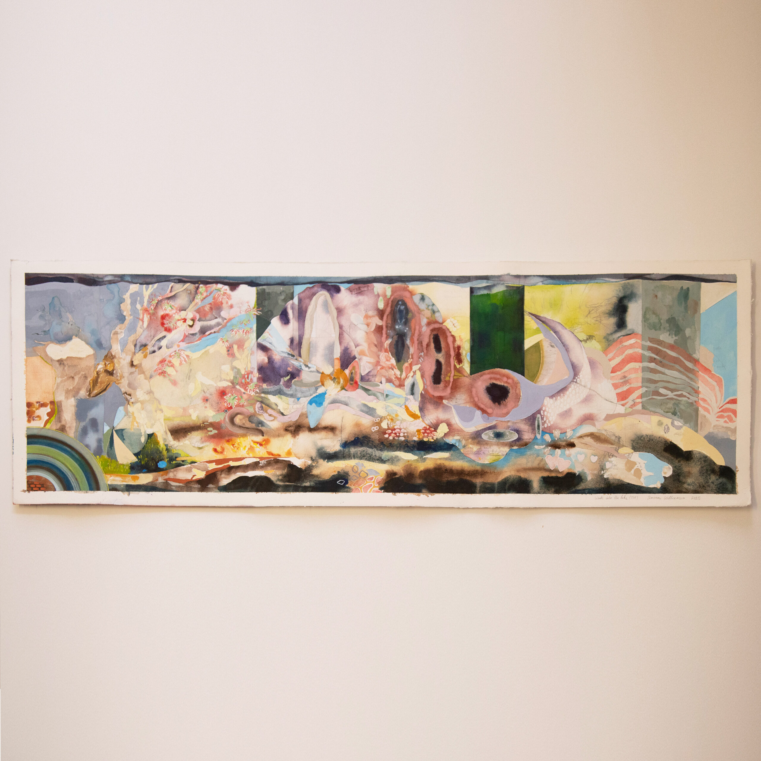 Wade into the lake (resomate), gouache and graphite on paper, 350 x 1000mm, 2025