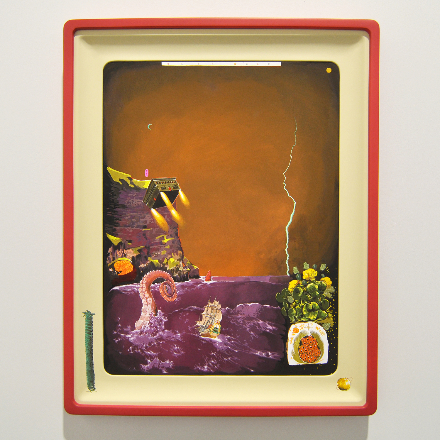 In seeking to go somewhere new and unfamiliar, I naturally staged the newness in a familiar place. Having sought for a way to work with the subantarctic islands for years (since seeing them on a voyage some years ago) I remained open to ideas. While having a drink with some friends after a meeting at Astrolounge in early 2019, I decided it would be an idea to depict a sci-fi landscape around a fictional subantarctic island that people hadn’t got to. The cat was asleep on the mat is a nice image but not a very good story – but the dog was asleep on the cat’s mat is better. Accordingly, I set up a crude narrative by means of an old idea – a strange emperor – and sent a ship to disturb it in its own realm. These parameters also allowed me to explore issues of human exploration, and of discovery, and of the cost to the discovered region. Thus secured, I started out on some large paintings to depict matters. They were difficult and they took months to complete, but they were done, and were set in frames of unseen splendour made exquisitely by David precisely to my unrealistically preconceived idea. In the first painting, the ship with its crew has arrived at the shores of the island, with a huge storm brewing, and is confronted by the Cerberus-like kraken which destroys all comers. The prognosis is plainly grim, but the ship presses on. Once they had finished up on the island they discovered such wonders as they had not imagined, as seen in the other paintings in the show.