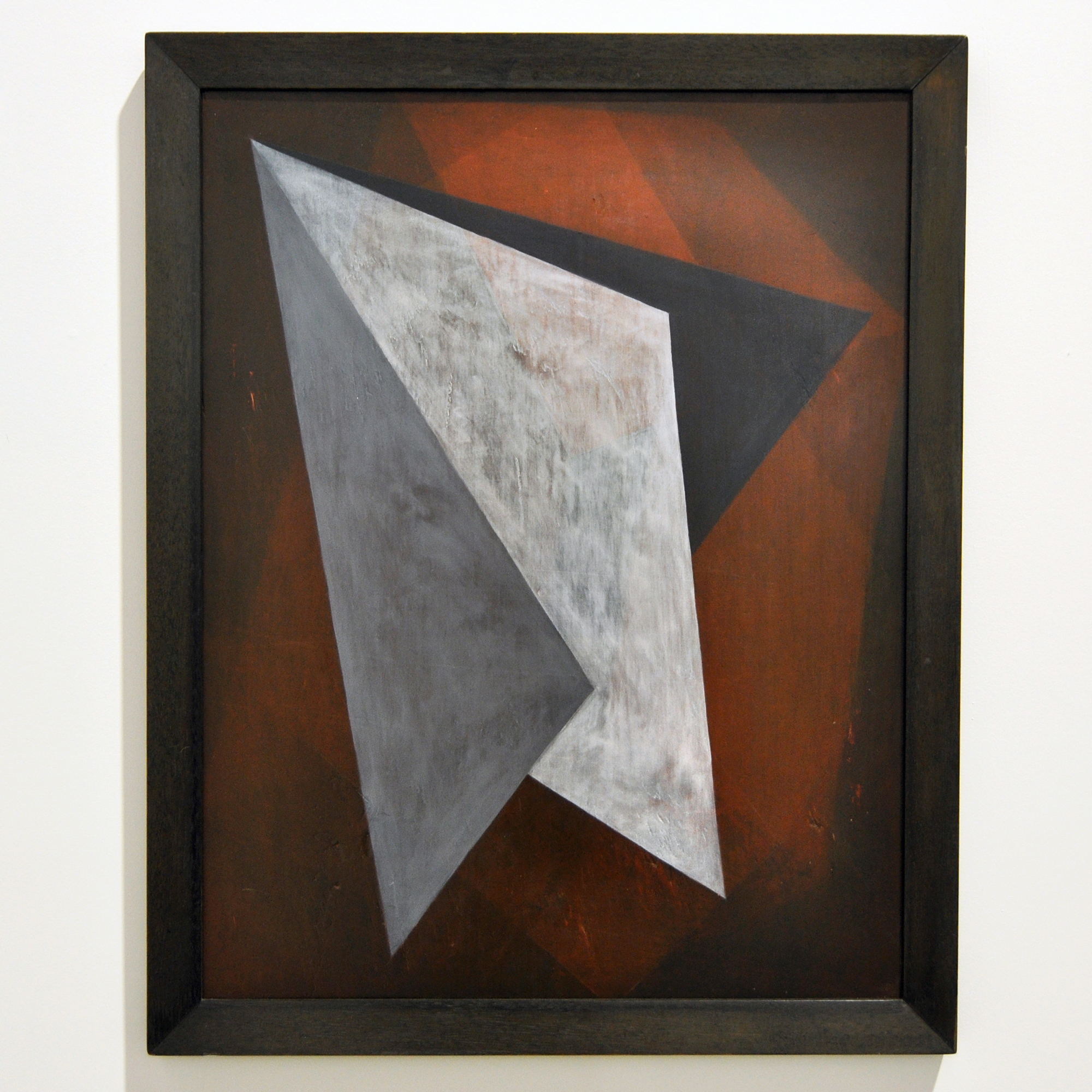 The painting is made up of two different shapes on two layers, the first is the box shape (taken from the box kite) and the two triangular shapes which is a stylised plane shape and is a bit of a pun on the word plane. These two layers were painted over and over until the finished work was achieved. Why the colours? Well to me black and white (grey) have always worked well with red and helps make the shapes stand out from the background and there is the influence of the Russian Constructionism artworks. The name ‘Tectonic’ comes from the Russian artist Liubov Popova who used the word Architectonic in the title of her work.