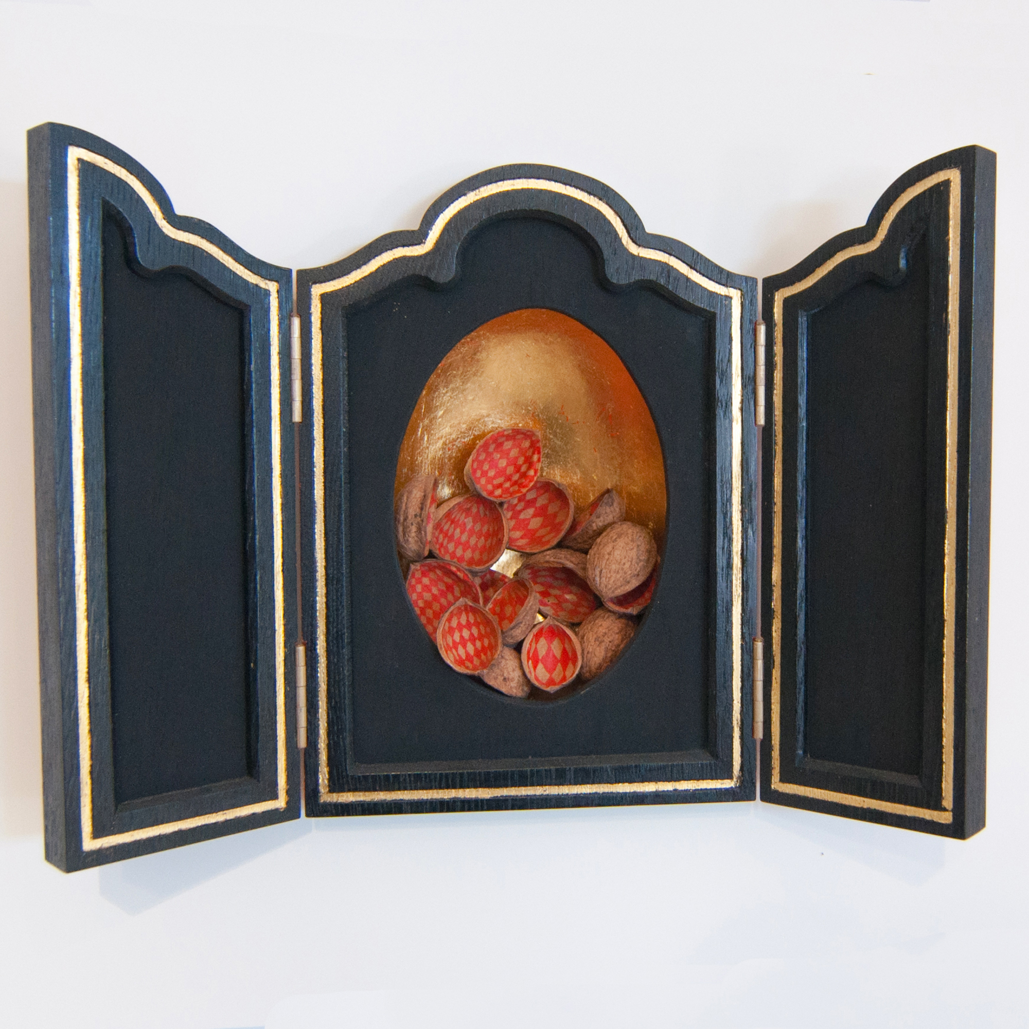 Hoard, 2015, walnut shells, gold leaf, brass, paint and oak, $2900