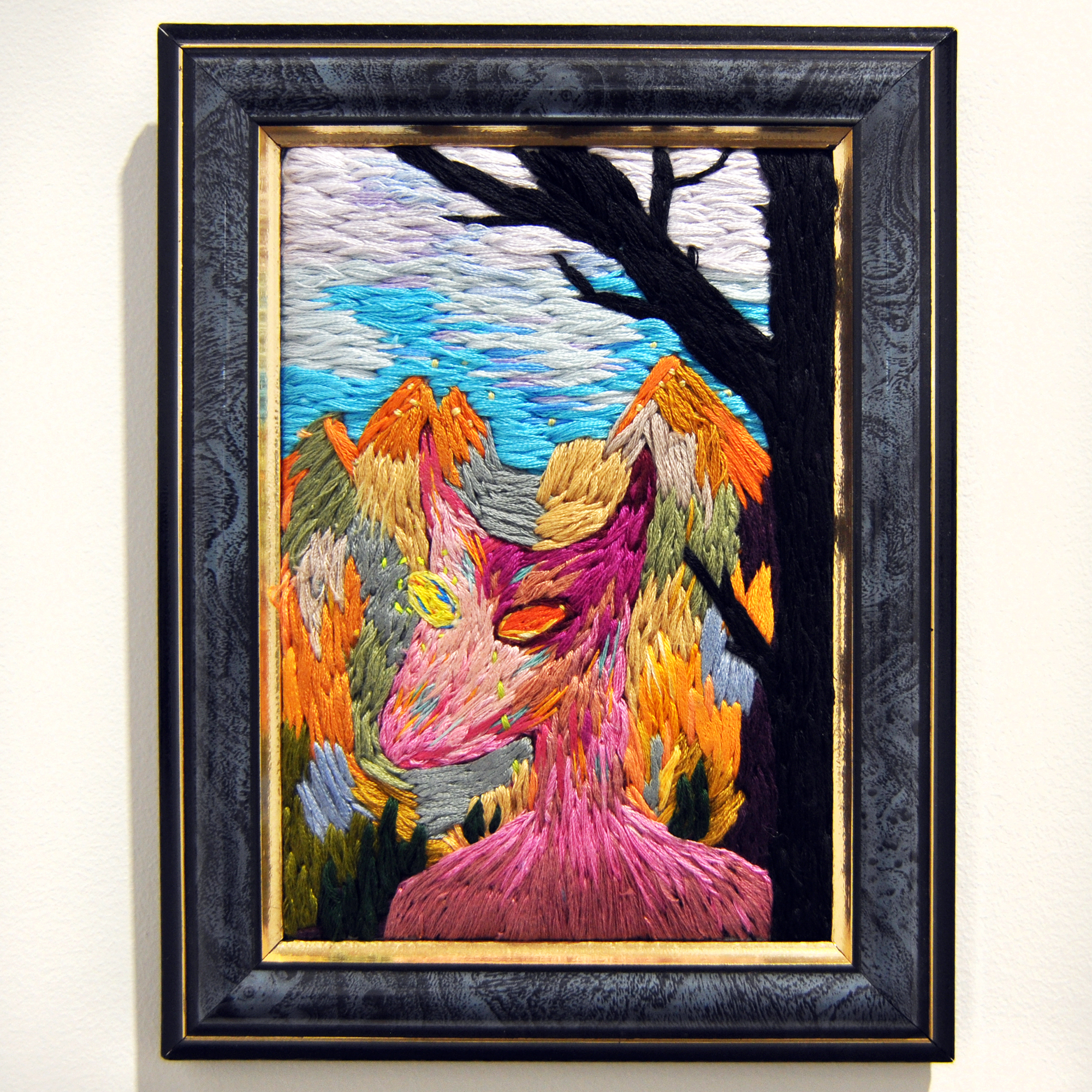 (This piece was made using embroidery thread on calico fabric. I did a sketch and then transferred the drawing to a piece of fabric. I then stretched the fabric on an embroidery frame where I used the thread to give dimension and colour. The piece is indeterminate in nature, pointing towards a time many eons before or many eons after humans existed.)