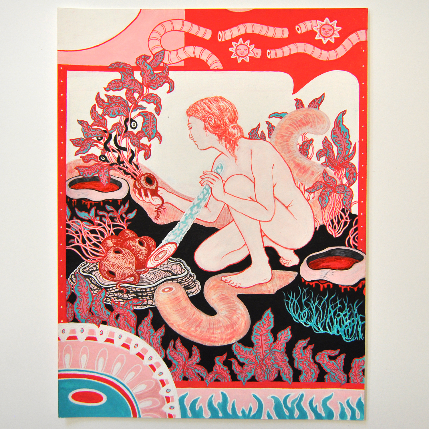 Christiane Shortal: I like to think I’m world building, like in a video game. I hadn’t drawn figures or plants for ages – my previous exhibition was mostly anthropomorphised scenes, drawing from my memory of what things looked rather than from real samples. For this collection of works I’ve incorporated more humanistic things which create a weird clash when you have strange otherworldly things around them. I really wanted these works to feel like they’re elements of a civilisation so I intentionally world-built more for this show.