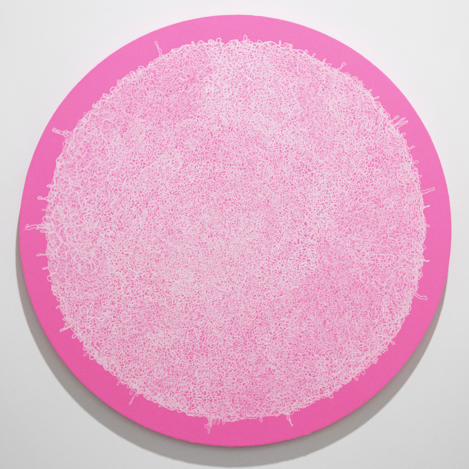 2 hours 35 minutes 41 seconds continuous line with my eyes closed, Ivan Lupi, acrylic and oil marker on wood panel, 900x900mm, 2024