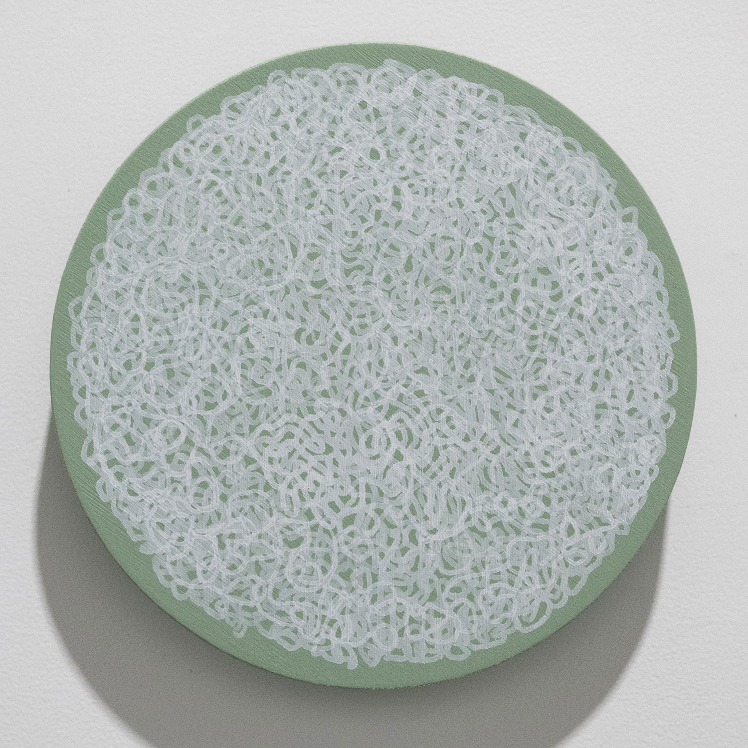 31 minutes 2 seconds continuous line with my eyes closed, Ivan Lupi, acrylic and oil marker on wood panel, 200x200mm, 2024
