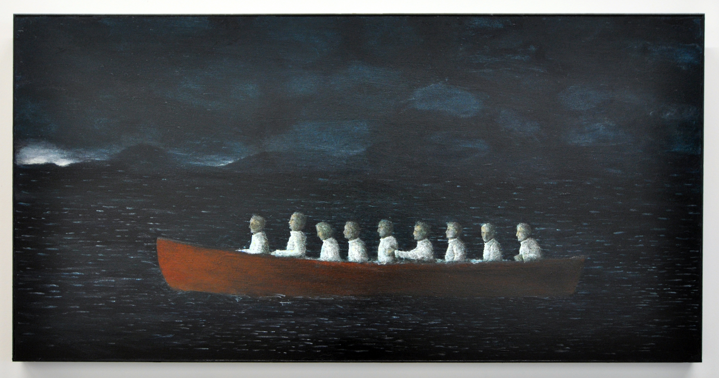 In the second series of works Madill tracks the promise – or threat – of the sea journey. This is a dark or twilight world, a place of oppressive skies reflected in the unstill seas and hill-shrouded waterways. In Landfall nine men, their white shirts flaring in the darkness, travel across a rough and inky sea. There are no oars, their destination is unclear, their faces unemotive as the boat traverses like a ghost ship across the board. In other works, young girls in Victorian dress stand uncertainly in their small boat, vessels float empty on the ocean, women wade out to a waiting craft.