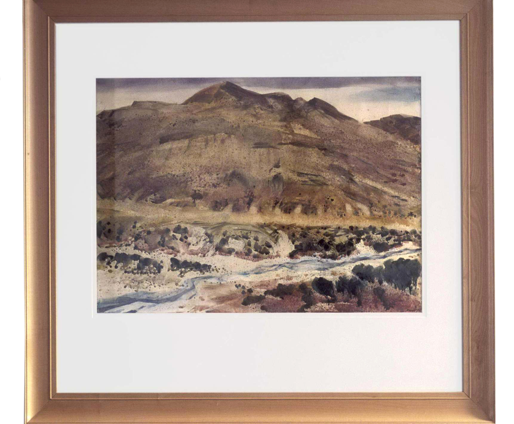 Doris Lusk, ‘Hill and Stream Near Kurow’, watercolour, 1971, 1060 x 1150mm (framed). Image courtesy of Lincoln University