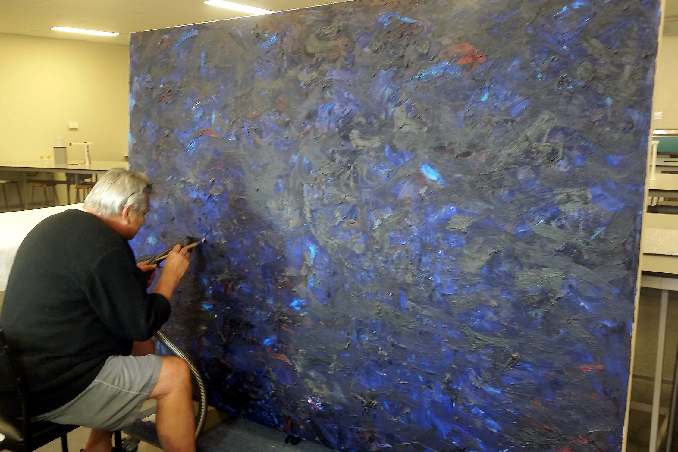 Painting conservator Edward Sakowski cleans Neil Frazer’s “Blue on Blue” oil on canvas, 1987