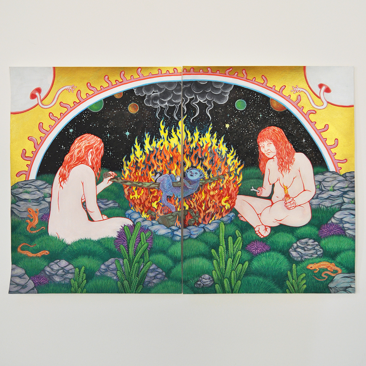 Worldbuilding and creating connected systems is my main impulse with art making. I draw from a lot of different historical sources. Often religious or cultural artworks are devoid of names or signatures because they were just visual communicators for people and the concept of having a personal brand or anything like that was irrelevant and not important at the time. I like that they are their own self-contained things, almost appearing out of nowhere and can’t be traced back to a particular hand. That being said, I think a lot of my influences are artists that draw from ancient art forms in a contemporary way like Kushana Bush, Mu Pan and Kristen Liu-Wong.