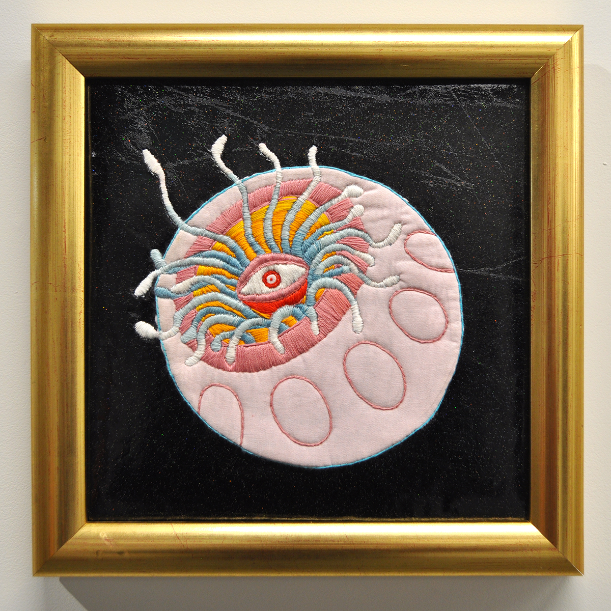 I think when you are religious you feel like there are malign or malignant entities stalking you all the time, that you are being watched. From a young age my Mum would say she had ‘eyes in the back of her head’ while on the other hand I was being told that the devil was probably in my room and I would have to dispel him to get a good night’s rest. So I think I have this residual anxiety of being watched and someone waiting for me to do something bad so they can criticise or terrorise me. I’m sure for some people this mindset makes them feel comforted and taken care of and sometimes I did have that, it’s this dichotomy between safety and terror. I think this show/the paintings are more about feeling comfortable sitting between these two things. Whereas the embroideries are the embodiment of an unknowable entity with motivations outside of our comprehension or experience.
