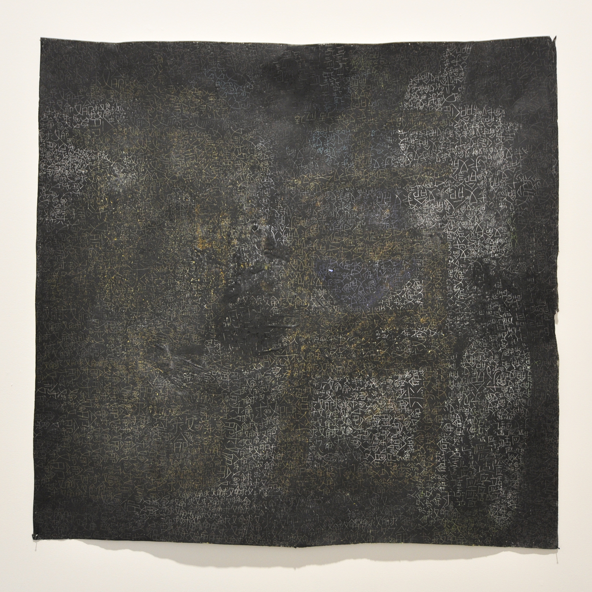 Once it reached me, this work became paper laboured over, touched, marked, crumpled, subsumed in amber medium – then placed behind dark glass and photographed, foggy echoes of the original material lurking at the edges of the digital print. Then again marked, with crumbling matter and liquid flows, summoning Eve’s lines from memory as I grappled with the meaning of rectifying. The process has been one of accumulations over and of time – of varied intent and preoccupations, of many physical changes, the anxiety of the permanence of a mark, and the dissonant pleasures of erasure and accretion.