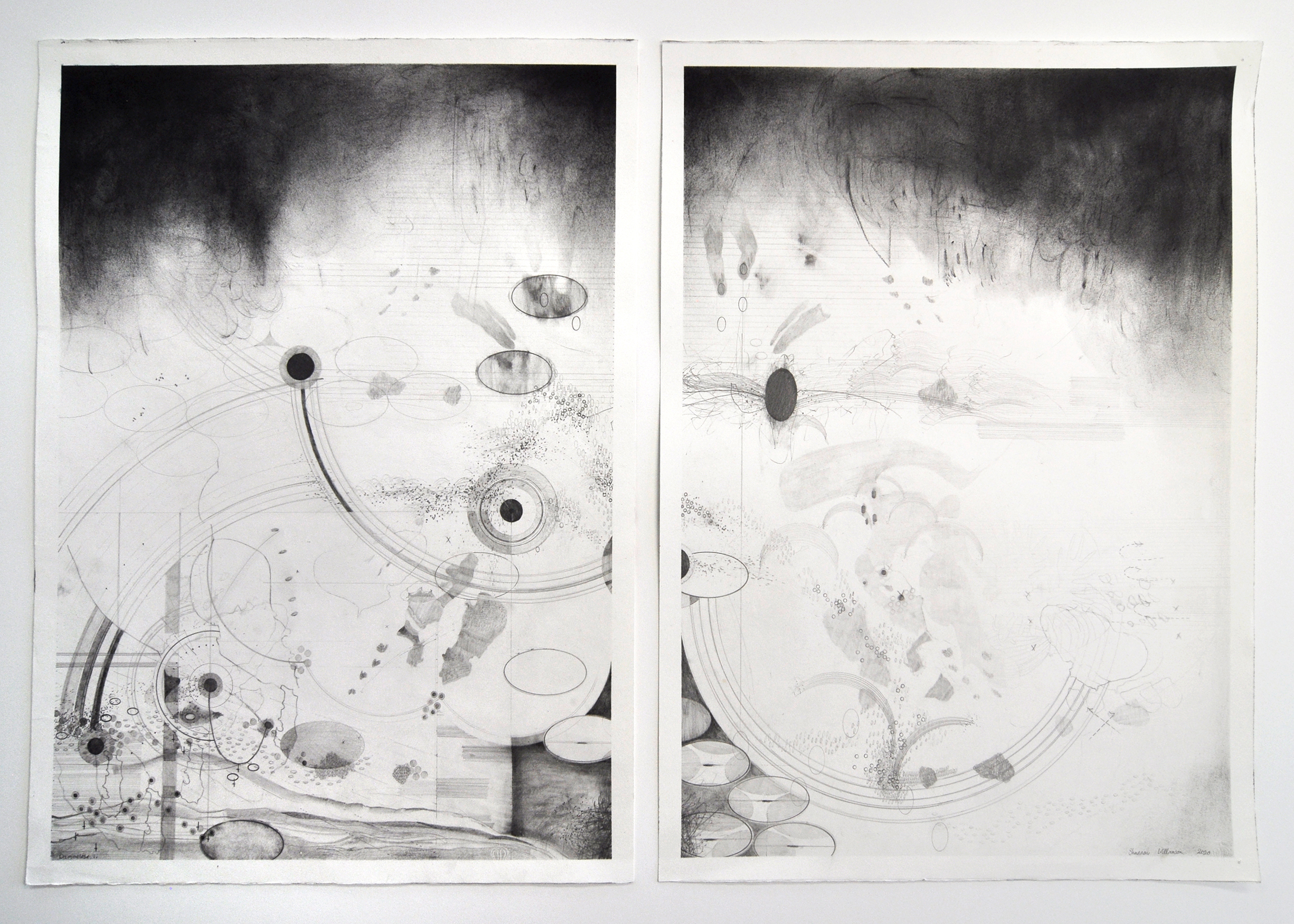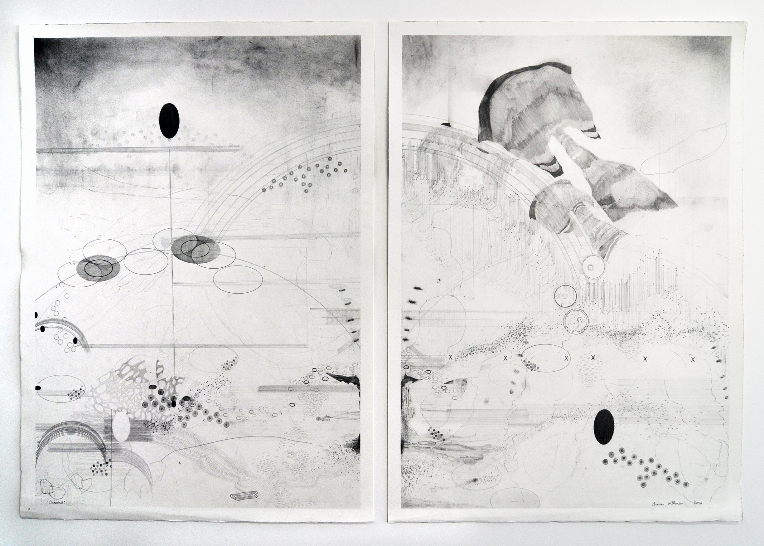 ‘Damocles ii’, Shannon Williamson, pencil and charcoal on paper, diptych, 700x1000mm, 2020