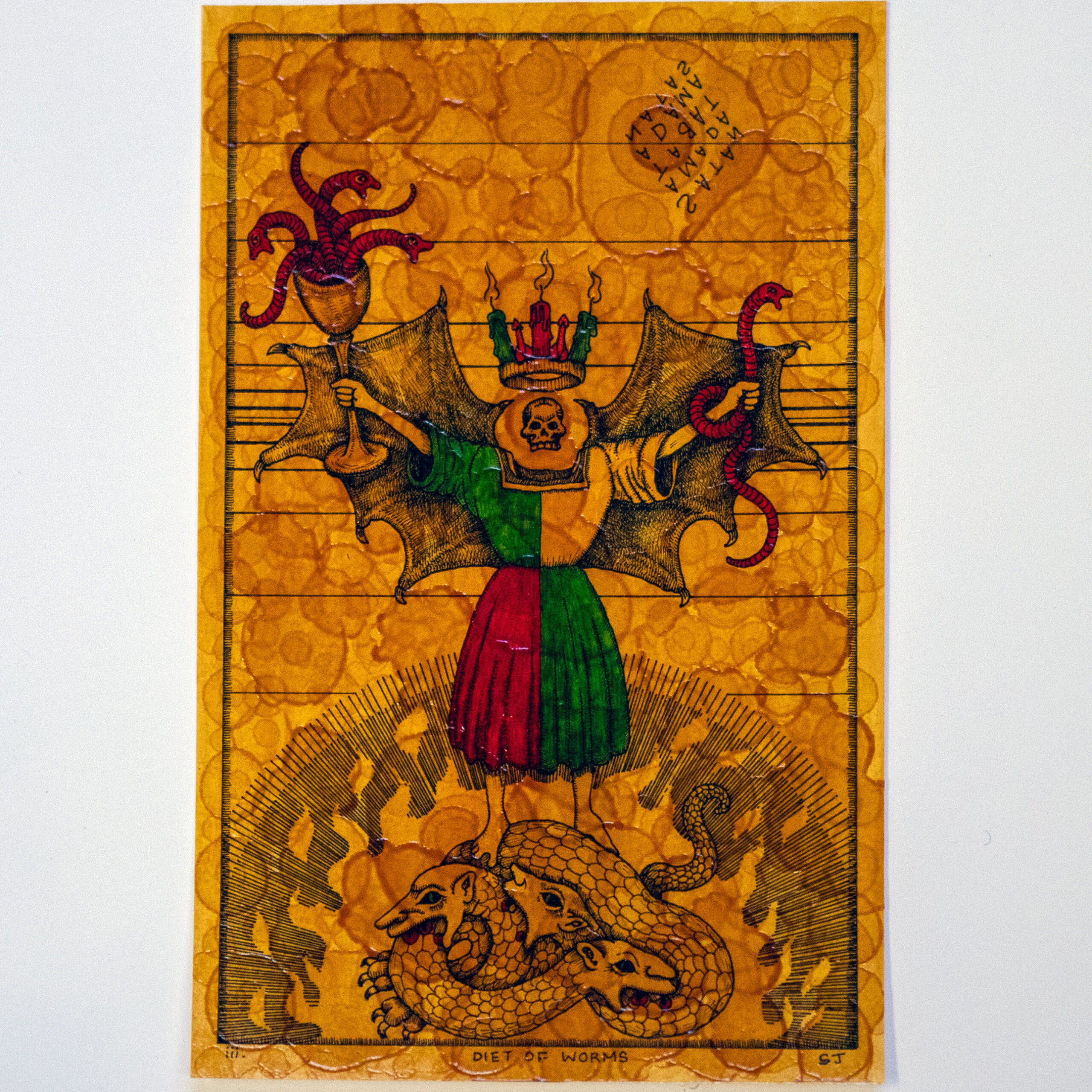 It’s like you’ve smashed together a dream-like medieval aesthetic with doodled cartoons from the margins of a notebook. You strike balance in the looseness but obviously considered drawing, and in the content of the works – such as your reference to the 1521 Diet of Worms (a fairly obscure academic thing to know about these days) but depicting a winged figure with goblets of actual snake-like worms. How do you see those balancing contrasts in your work?