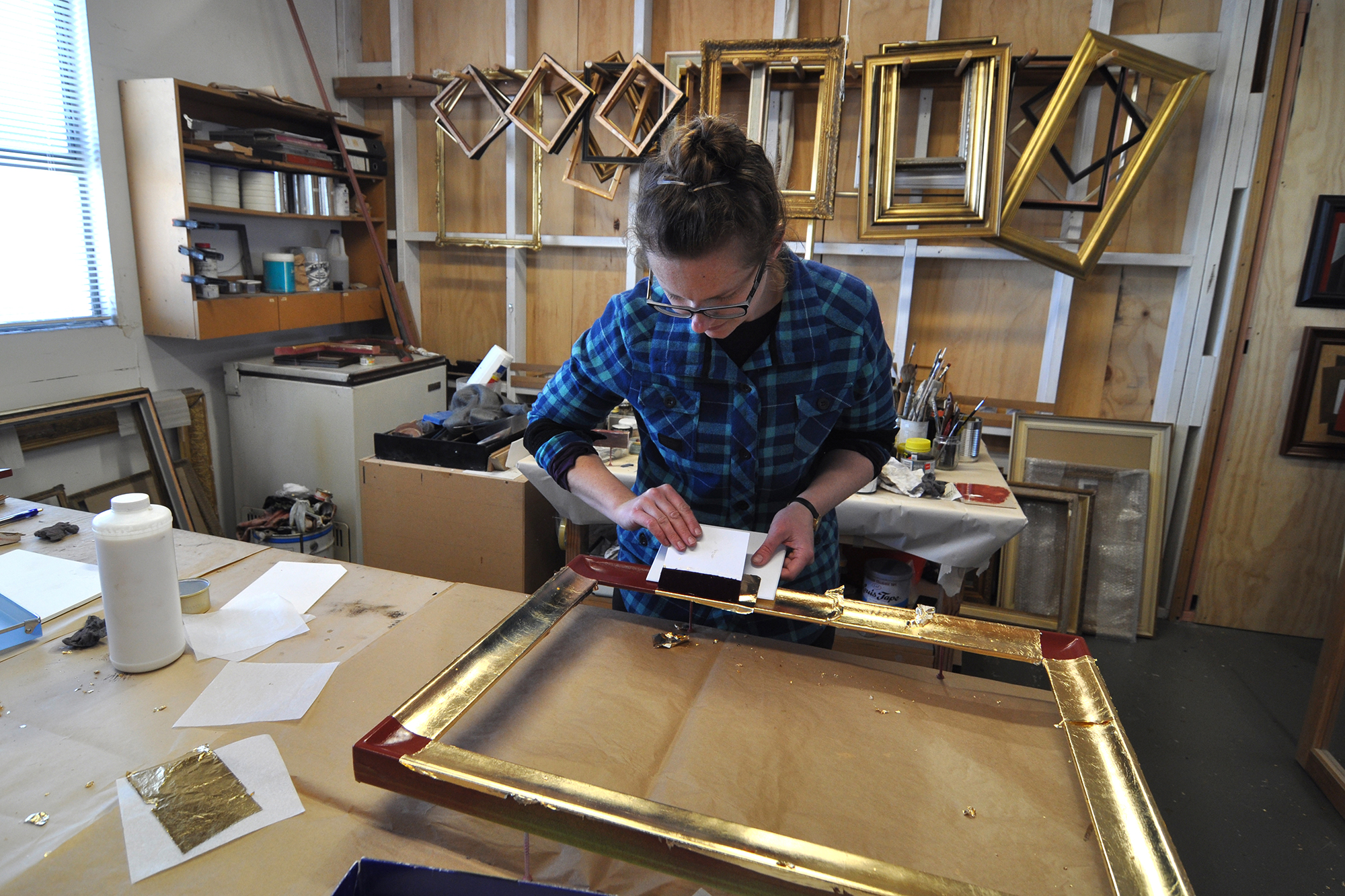 City Art Depot staff member Alyse hand gilding one of our custom made frames